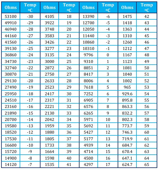 By default, the temperature is automatically calculated with pre-set Steinhart-Hart coefficients. The default coefficients are derived by applying nonlinear regression to the following HMA Vibrating Wire Piezometer (Model 1200) resistance temperature table.